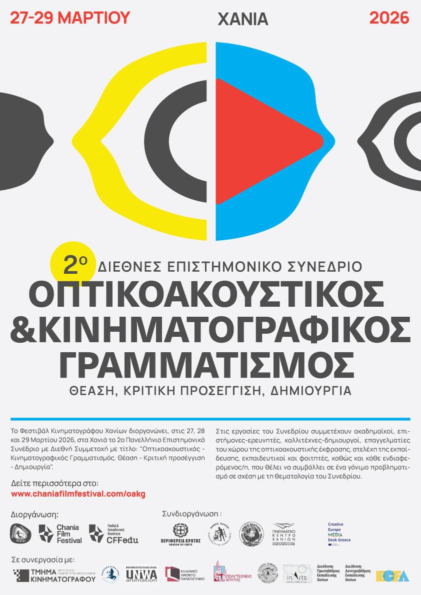 Το Φεστιβάλ Κινηματογράφου Χανίων διοργανώνει, στις 29, 30 και 31 Μαρτίου 2024, στα Χανιά το 1ο Διεθνές Επιστημονικό Συνέδριο με Διεθνή Συμμετοχή με τίτλο "Οπτικοακουστικός & Κινηματογραφικός Γραμματισμός. Θέαση - Κριτική προσέγγιση - Δημιουργία".